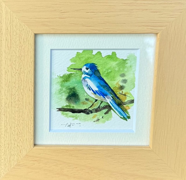 水彩/サイズ内寸6.5×6.5cm(絵の部分) 森には沢山の鳥たちがやってきます。 春にはウグイスにホトトギス、おなじみさんのシジュウカラ、ヤマガラやヒタキ、コゲラ、ヒヨドリ、夜にはフクロウが鳴くこともあります。でも青い鳥には、まだお目にかかったことがありません。 かつて、山あいの温泉に投宿した折に、オオルリでしょうか、青い鳥を見つけました。その時の感動がいまだに忘れられません。 ■ちび絵シリーズ ちび絵は、アーティストの愛情が込められた小さな作品です。 自宅やオフィスに飾れば、毎日を特別なものにしてくれることでしょう。手軽にアートを楽しむことで心の豊かさを感じていただけます。ご自分用にはもちろん、贈り物としてもおすすめです。
