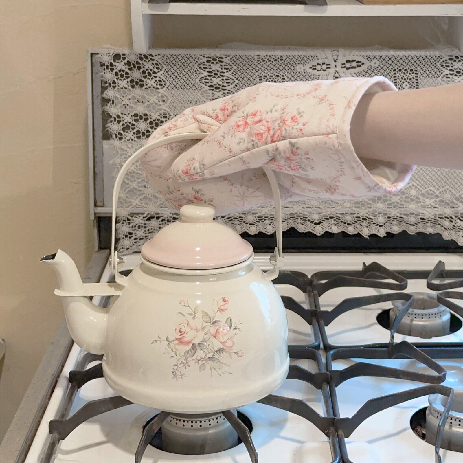 ローズの花束とピンクのガーランドが可愛いマリアローズのふかふかミトン。厚みのある素材で熱さをしっかりガードします。持ち手の熱くなるほうろうのケトルやポットと合わせて使ってほしい逸品。紐が付いているため収納に困りません。キッチンに吊り下げてあるだけで華やかになりますよ♪