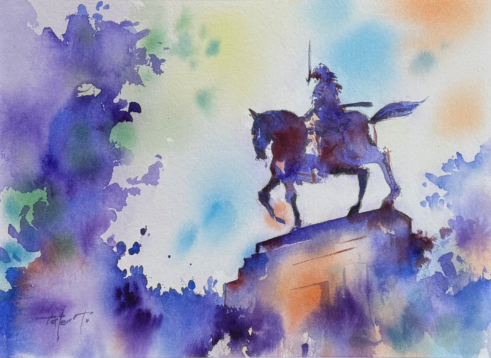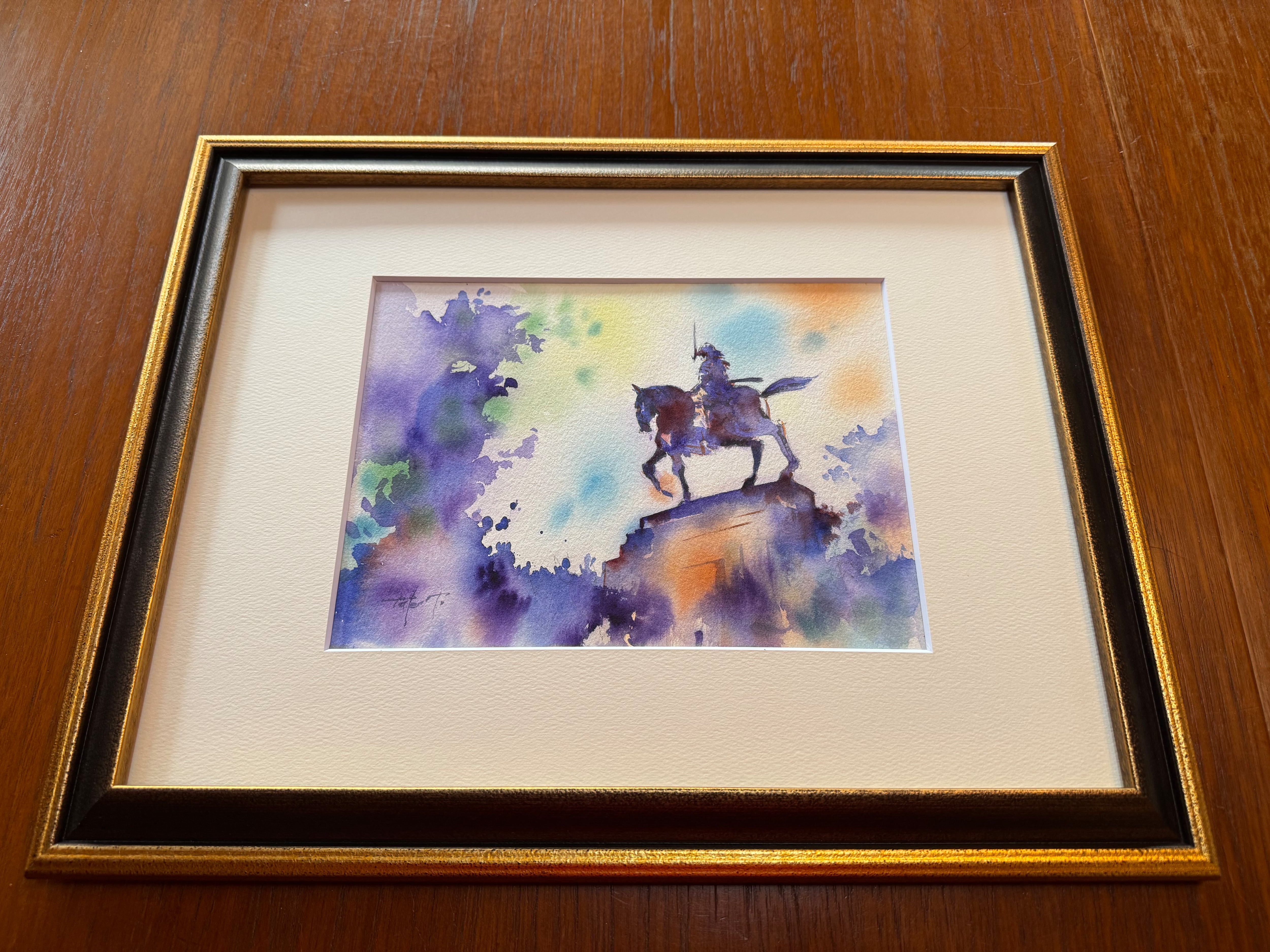 この美しい水彩画『蒼い残像』は、青葉城址に立つ伊達政宗公の騎馬像を描いた作品です。